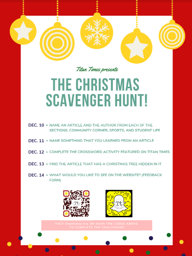 It’s that time of the year again! Christmas is upon us, and Titan Times has a gift for you! From Monday, December 10th to Friday, December 14th, students will have a chance to win gift card prizes by completing the challenges.