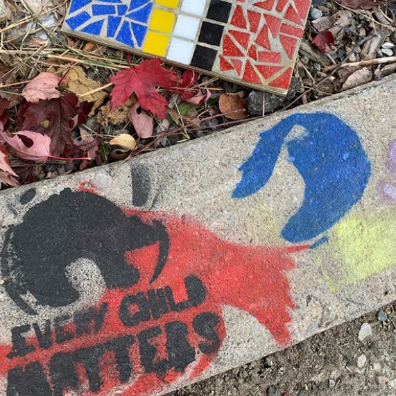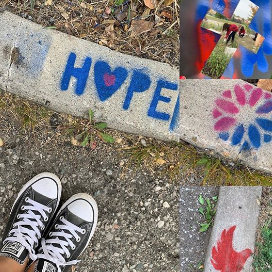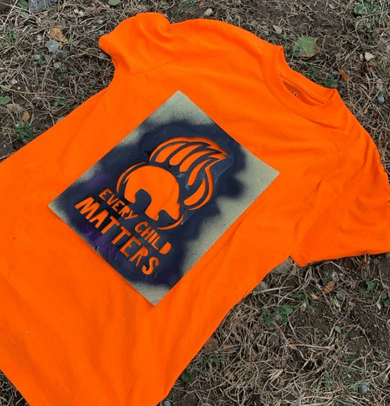 These pictures were taken on Orange Shirt Day. Orange Shirt Day is when we honour the Indigenous children who were sent to residential schools in Canada. Our HOPE Garden is not only showing art but it is giving awareness to those who walk by. Stencils were used to spray paint on the t-shirts so they could be worn at school as well. It is astonishing to see how art brings us together and the meaning behind every piece, remember that Every Child Matters!