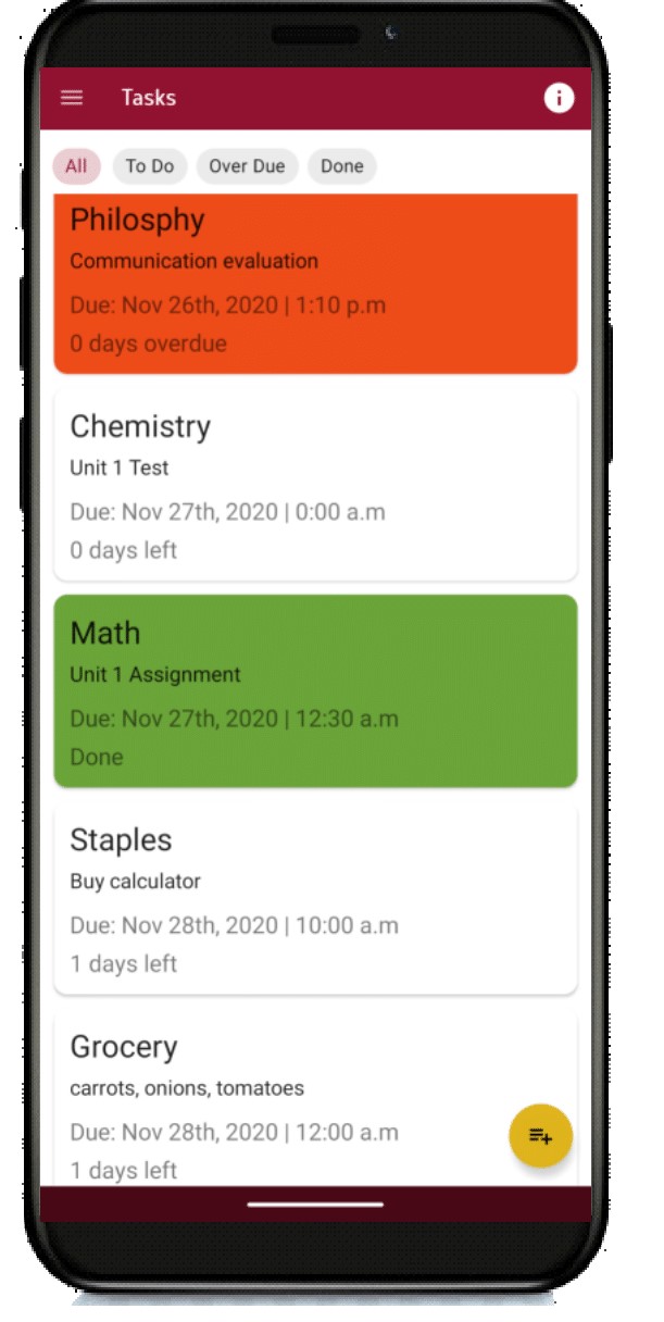 Some features available exclusively on the Android app is that it has a tasks section as well as additional links in the resources section. The tasks section allows users to take notes and set reminders, with the unfinished tasks appearing in white, and finished tasks appearing in green. The links section is split into four sections: resources, online environments, tools, and social media. Clicking the icons under these sections will bring you to the corresponding webpage.