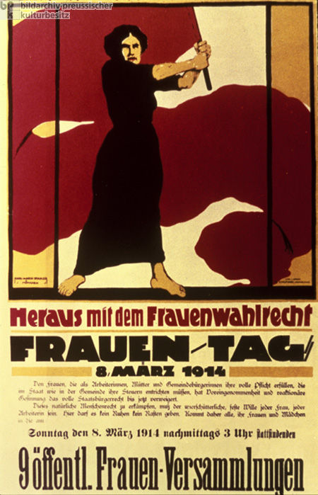 On March 8, 1914, this German poster called for a public gathering in support of women’s suffrage. The translation states: “Give Us Women’s Suffrage. Women’s Day, March 8, 1914. Until now, prejudice and reactionary attitudes have denied full civic rights to women, who as workers, mothers, and citizens wholly fulfill their duty, who must pay their taxes to the state as well as the municipality. Fighting for this natural human right must be the firm, unwavering intention of every woman, every female worker. In this, no pause for rest, no respite is allowed. Come all, you women and girls, to the ninth public women’s assembly on Sunday, March 8, 1914, at 3 pm”