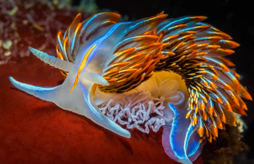 These one-of-a-kind sea slugs are admired for their bright hues and interesting shapes. Their scientific name, Nudibranchia, comes from the Latin word nudus and the Greek word brankhia, which together mean “naked gill,” as per the gills on their bellies. Nudibranchs (pronounced NEW-dee-bronk) are mollusks that defend themselves from predators by camouflage, releasing foul-tasting substances or attacking with their stinging cells (Britnell and Britnell).