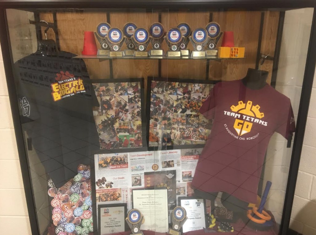 Walking back and forth in front of the cafeteria, you can stop and see a new glass cabinet filled with awards and memorabilia from the competitions and team activities of one team at St. Augustine. Their story is outlined in this article.